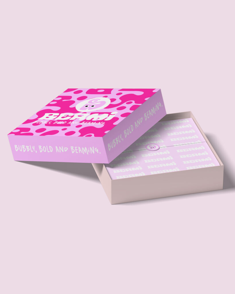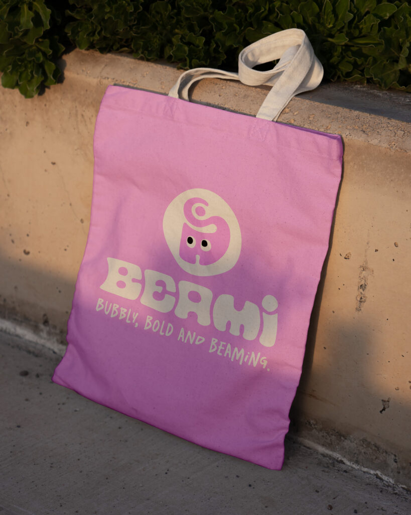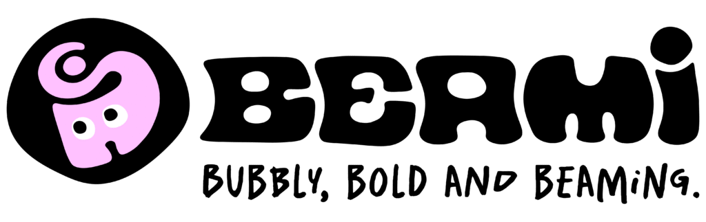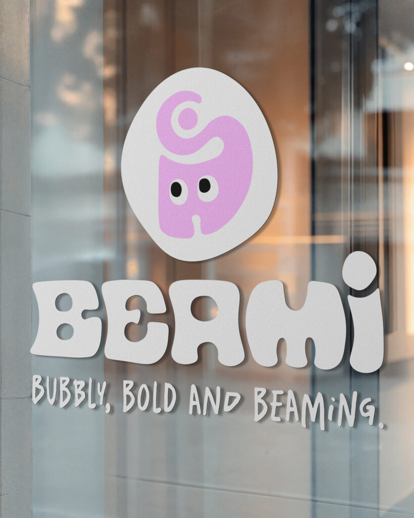 Beami – Be me! Företagsmärket och logotypen är tilsammans lekfull, bubblig och avspeglar den slogan som varumärket står för – Bubbly, bold and beaming.