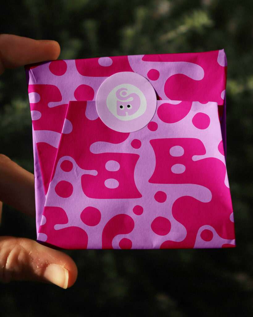 Logotypen är rund, bubblig, fräck och modig. Uppblåsheten i bokstäverna ska kännas lekfulla, lite som såpbubblor eller varför inte hubba bubba. Pricken över i’et fångar upp pärlorna i skapandet, såsom i företagsmärket.