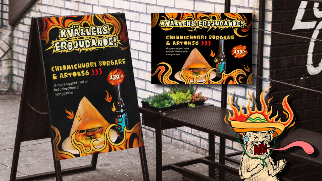 Jag började med att brainstorma olika illustrationsstilar på Pinterest för att ta fram en stil jag ville köra på. För att komplettera Trappans GP med starka klistermärken och 90-tals funk, valde jag att även här illustrera i liknande stil – men med en större frihet i uttryck. El gato med den brinnande sombreron symboliserar lätt temat på maten, och det sandiga uttrycket på typsnittet känns som en het strand i Mexiko.