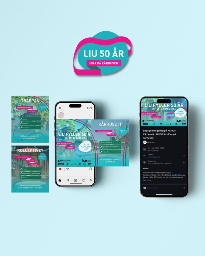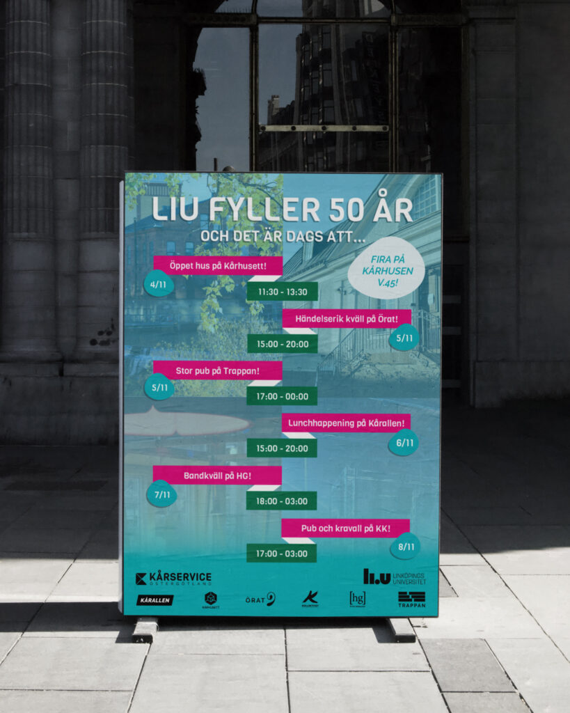 LiU fyllde 50 år och skulle i samarbete med Kårservice fira detta under v. 45 på kårhusen med olika event. Jag fick i uppdrag att formge och skapa grafiskt material för olika medium till denna vecka.