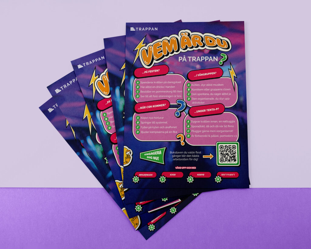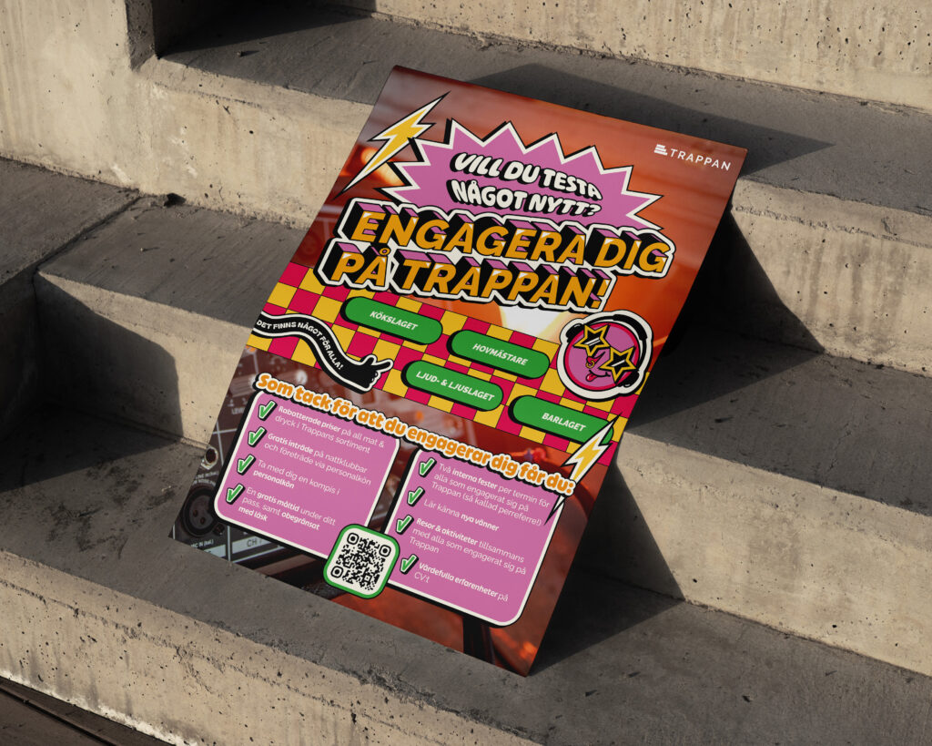 Jag fick i uppdrag att skapa tryckt och digitalt material för att marknadsföra rekryteringen av ideell personal till Trappans verksamheter.